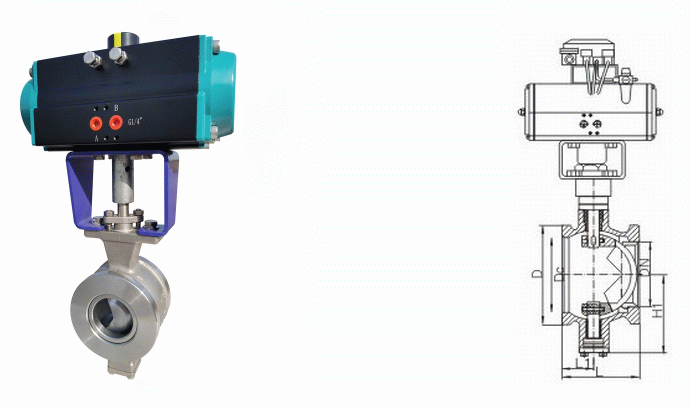 不锈钢气动V型对夹球阀外形结构图: