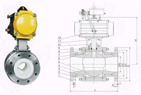 陶瓷气动V型调节球阀外形结构图: