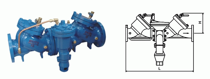 倒流防止器当出水端无水流出,若进水端供水压力保持恒定,且进水端水压高于阀腔内水压,压差0.024MPa≤△P≤0.055MPa,泄水阀处于关闭状态;当出水端无水流出,若进水端供水压力出现下降,虽然进水端水的压力仍高于阀腔内水的压力,但当△P在0.012MPa~0.023MPa左右时,旁通泄水阀就开启泄水,阀腔内的水(或部分)被排出;当出水管路因某种原因而水压上升,而且出水止回阀泄漏,造成阀腔内压力上升,这时当△P在0.012MPa~0.023MPa左右时泄水阀开启将反流水排出,只要泄水阀开启,空气立即通过与大气相通的漏水斗进入阀腔,形成空气隔断。