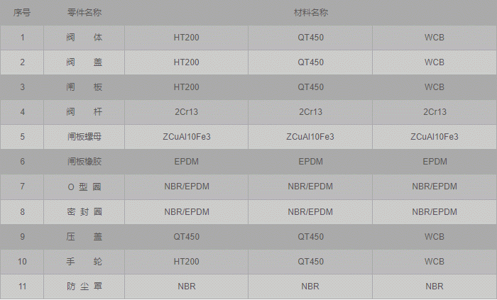 软密封法兰闸阀零件材料: