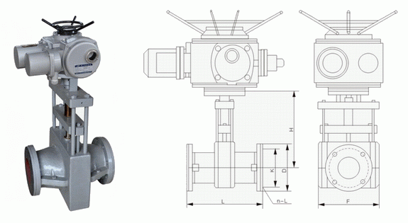当电动头顺时针转手轮时,使大小阀杆同时带动上下压板以压缩管套从而进行关闭,反之即行开启。这样,压板在拉杆之间上下往复运动来完成阀门开闭工作。