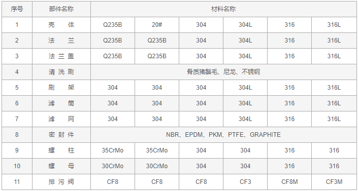 Y型全自动清洗过滤器零件材料表: