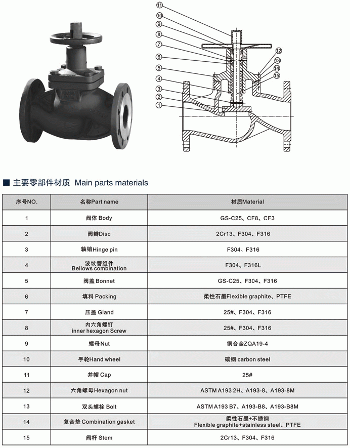 先进技术,采用先进的金属波纹管密封技术制造,高性能金属波纹管,波纹管密封截止阀采用波纹管密封的设计,完全消除了普通阀门阀杆填料密封老化快易泄露的缺点,不但提高了使用能源效率,增加了生产设备的安全性,减少了维修费用及频繁的维修保养,还提供清洁安全工作环境。适用于公称压力PN1.6-4.0MPa,工作温度-20~350℃的石油、化工、制药、化肥、电力行业等各种工况的管路上,切断或接通管路介质。