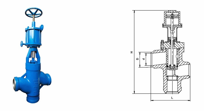 高加联成阀包括阀体、阀座、阀瓣、阀盖和活塞控制装置等,其阀体为三通式,具有一个进口通道和两个出口通道,给水由侧面下进口引入,向下出口进入高压加热器,另一侧上出口与旁路管道相连接。该阀有上下两个密封面,高加正常运行时,阀门开启,阀瓣上移与上密封接触,旁路切断,高压水由给水泵从三通高加旁路保护阀侧面下通道,由下出口进入高压加热器;当高加发生故障或其它原因需要甩高加时,阀瓣下移,关闭阀门,给水通过另一侧上出口由旁通管道直接进入锅炉,甩掉高压加热器,使高加安全解列,从而保障机组正常运行。