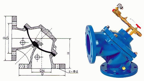 角式隔膜排泥阀内部是由特殊强化的隔膜片、不锈钢弹簧等组成。具有开启快,关闭压力低等优点,经由外部液动(气动)控制管路,集中控制,启闭主阀作用等特点。