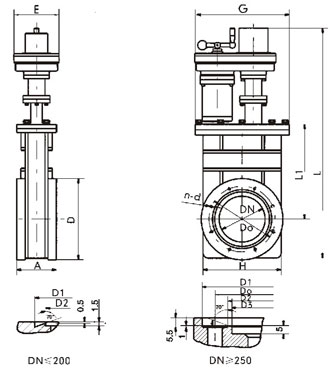 型号 DN A H D Do D1 D2 D3 L L1 G E n-d 法兰标准