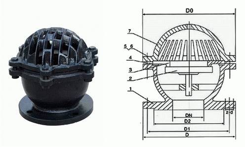 底阀由阀体,阀瓣,阀盖,衬套,密封圈等零件组成,详见下图水源的水从阀盖进入阀体。在流体的压力作用下,阀瓣打开水,当示停后出口管内的压力将阀瓣迅速关闭,液体将不会倒回水源,起到了即畅通抽水又节约水能损失的作用。