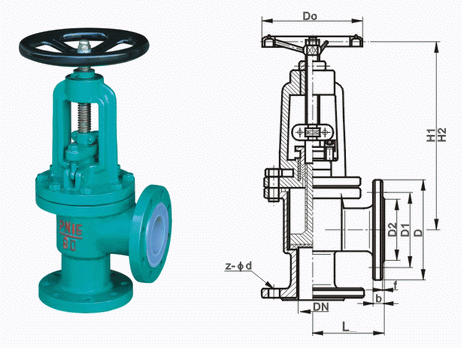 衬氟角式截止阀是指关闭件(阀瓣)由阀杆带动并沿阀座中心轴线做升降运动的阀门,在管路上主要用来接通或截止断管路中的介质,但不能做节流用 。衬氟角式截止阀具有结构紧凑、启闭灵活、耐腐蚀性能强,行程短(一般为公称通经1/4)等优点。J44F46衬氟角式截止阀适用在-50℃~150℃的各种浓度的王水、硫酸、盐酸、氢氟酸和各种有机酸、强酸、强氧化剂,FEP还适用于各种浓度的强碱有机溶剂以及其它腐蚀性气体、液体介质的管路上使用。