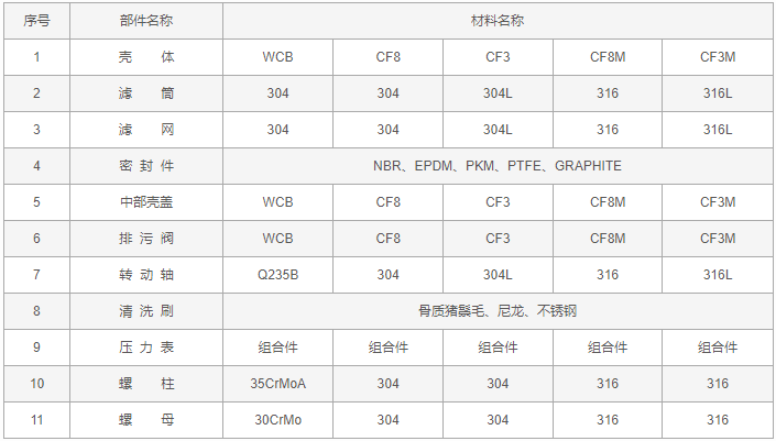 手摇刷式Y型过滤器零件材料: