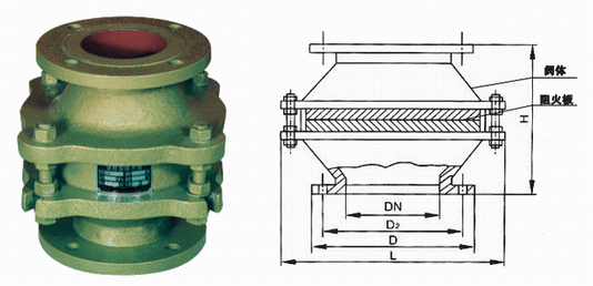 ZGB-1波纹型阻火器,用于安装原油,汽油、煤油、柴油、芳烃,硫等固定顶式储罐上的重要安全设备。它的功能是允许易燃易爆气体通过,对火焰有阻止窒息作用。该阻火器结构合理,重量轻,耐腐蚀,阻爆性能合格,连续13次以亚音速火焰试验每次都能阻火。易检修,安装方便,检查时不用拆卸呼吸阀。耐烧性能合格,耐烧试验1小时无回火现象。阻火器芯子采用不锈钢材料,耐腐蚀,易于清洗。壳体水压试验合格。
