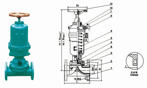 1、本阀门与其它阀门最大的区别在於:采用无填料函的构造;橡胶隔膜可使流道内的腐蚀性介质与所有驱动部件处於完全隔离的状态,从而杜绝了通常阀门的“跑、冒、滴、漏”等弊端。