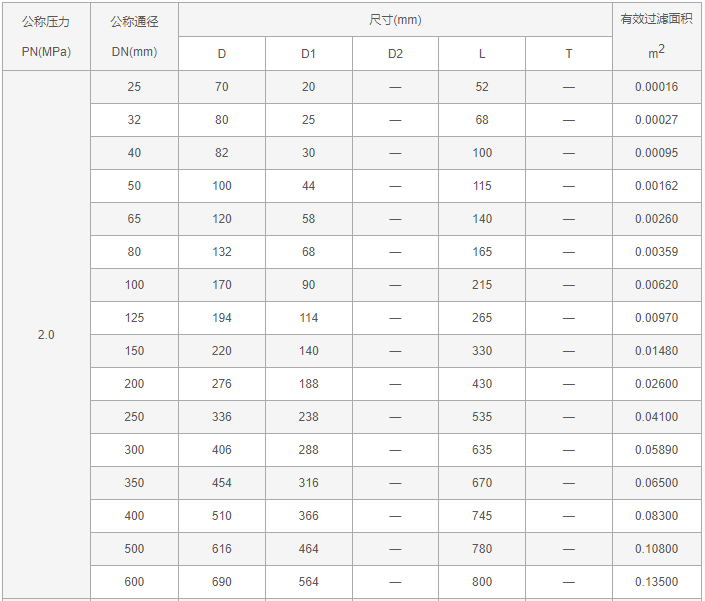 尖顶锥形过滤器外形尺寸表: