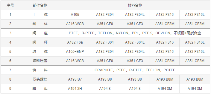 罐底放料球阀零件材料: