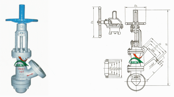管接放料阀有Y型及角式两种结构形式,根据实际工况的需要,放料口的形式设计有带管接及平底两种,阀体内腔装有耐冲刷、耐腐蚀的护板,在开启阀门瞬间,可以保护阀体不被介质冲刷、腐蚀,并对其整体进行化学镀Ni.P处理,使表面硬度达到HRC60—62,有耐磨、耐腐蚀的。阀座密封面与阀瓣密封面均堆焊有司太立硬质合金,密封副采用线密封,保证密封,密封的可靠性,并可防止结疤。阀门设有防转机构,保证阀杆在开启和关闭时只做直线运动,不做回转运动。阀门驱动方式有:手动、电动、气动、齿轮传动。