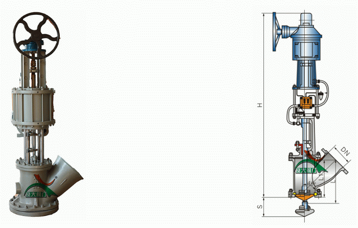 气动平底放料阀有Y型及角式两种结构形式,根据实际工况的需要,放料口的形式设计有带管接及平底两种,阀体内腔装有耐冲刷、耐腐蚀的护板,在开启阀门瞬间,可以保护阀体不被介质冲刷、腐蚀,并对其整体进行化学镀Ni.P处理,使表面硬度达到HRC60—62,有耐磨、耐腐蚀的。阀座密封面与阀瓣密封面均堆焊有司太立硬质合金,密封副采用线密封,保证密封,密封的可靠性,并可防止结疤。阀门设有防转机构,保证阀杆在开启和关闭时只做直线运动,不做回转运动。该阀主要由阀体、阀瓣、密封圈、阀杆、支架、阀压盖、手轮、法兰、螺母、定位螺钉等零件组成。
