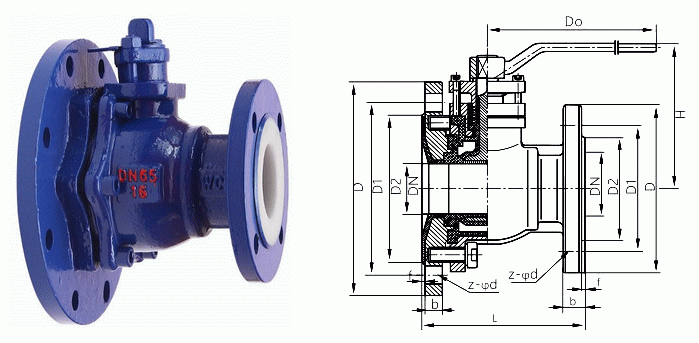 衬氟变径球阀是一种将球阀的阀盖改变成一个进料口呈倒喇叭形的上体,并能直接与反应釜釜底连接成一体,作为反应釜的放料口,阀体则完全按浮动球阀的装配要求设计的球式放料阀,其球体与釜底间距小,不混料和沉积死料的可能性很小。该阀与介质接触的过流部件上全部模压成型有氟塑料层,用来隔开流体与金属表面的直接接触,其中的球体与阀杆采用一体式金属嵌件外包氟塑料工艺制造,具有耐腐密封性好、操作灵便快捷、强度高及经久耐用等特点。