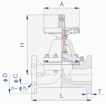 (6)采用螺杆升降结构,启闭力矩大,平稳性好。A、阀瓣开启,流体进入阀体,流阻小。 B、阀瓣向下缓闭,膜片向下开始变形,手轮旋转力矩小。