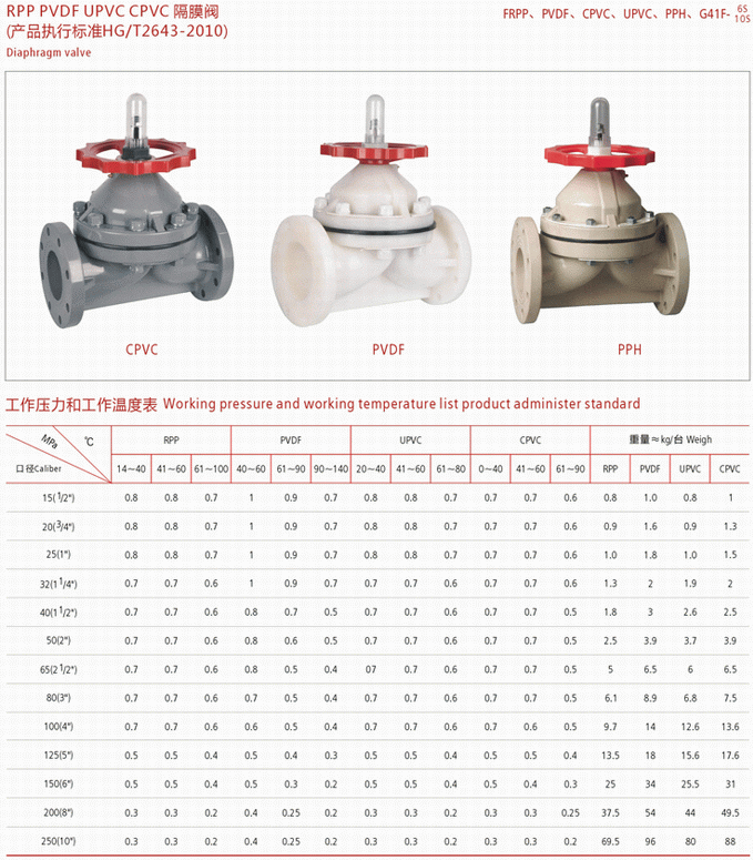 RPP,PVC,PPH,PVDF塑料隔膜阀的结构形式与一般阀门大不相同,是一种新型的阀门,是一种特殊形式的截断阀,它的启闭件是一块用软质材料制成的隔膜,把阀体内腔与阀盖内腔及驱动部件隔开,常用的隔膜阀有衬胶隔膜阀、衬氟隔膜阀、无衬里隔膜阀、不锈钢隔膜阀、塑料隔膜阀。现广泛使用在各个领域。