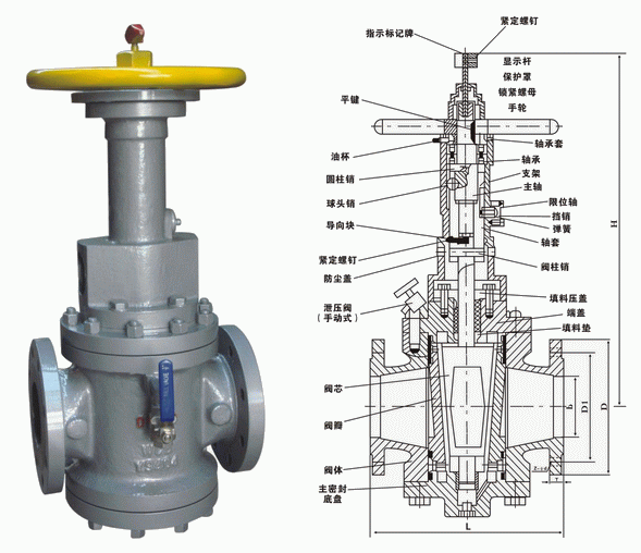 阀门关闭时,先旋转手轮,将旋塞及密封滑片旋转90°,然后旋塞向下移动,随着旋塞的运动时推动密封滑片向阀体内腔封面直至弹性密封圈被均匀地挤压到阀孔上下端,形成密封。