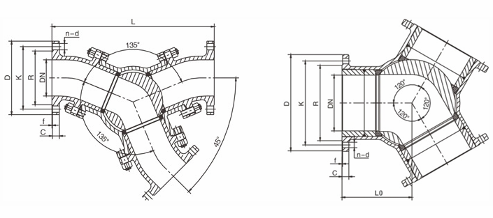 气动Y型三通球阀阀体采用的是一进两出(一个进料口,二个出料口)的Y形三通结构,其带柄球体两通孔呈120°或135°。该阀出厂初始状态为右出料口关闭,进料口与左出料口相通,当需要换向时,接通气源,气源压力作用在气缸活塞上产生一个推力,带动阀杆旋转120°或135°,球体位移,使阀门进料口与右出料口相通,左出料口关闭。本产品操作机构可选用120°或135°角行程GT、AT、AW系列双作用气动执行器。