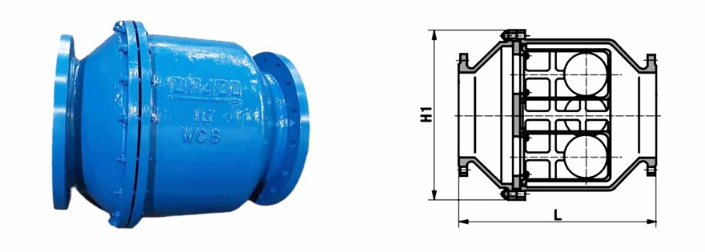 微阻球形止回阀是一种安装于水泵出口,采用外表面包覆橡胶的钢制空心球为阀瓣,在水流作用下,可在阀体内的滑道上滚动,从而打开或关闭阀门,以防止介质倒流和减小水击波的无磨损球形止回阀。该阀阀体内装有两个以上的由钢板加工成球芯、外表面经特殊工艺处理的橡胶球,胶球既有一定的弹性,又有足够的强度,其比重接近水的比重,当停水后,回流介质推动多个滚球分别压向阀座,靠阀体中心处的胶球先压紧阀座,其次是阀体中心轴线以下的或轴线两侧的胶球压紧阀座,中心轴线上边的胶球最后压紧阀座,阀门达到完全密封,实现关闭,由于管道断面上不同位置的水流速度存在差异,胶球回到球座的时间也不同步,起到了缓闭效果,而且胶球的弹性在关闭时起到了消声和减振作用。