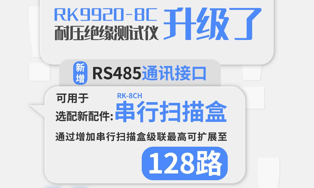 美瑞克RK9920-8C多通道交直流耐压绝缘测试仪在仪器后面板升级新增一个RS485通讯接口可用于连接选配件RK-8CH串行扫描盒,增加8-128个串行扫描通道,大大加快测量的测试速度。